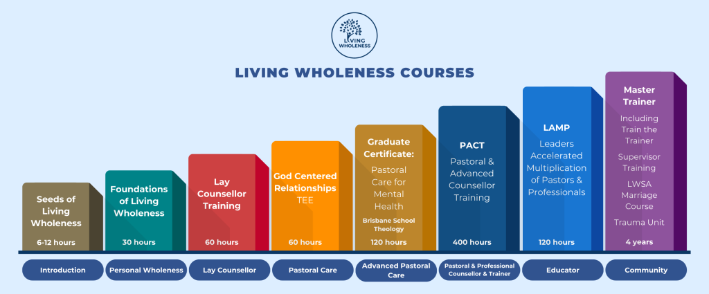 The Graduate Certificate in Pastoral Care for Mental Health aims to equip Christians to respond in God-Centred ways to those living with mental health struggles and/or suffering. The course equips students with both theological grounding and practical skills for engaging in effective pastoral care across professional, ministry, and mission settings. The course presents a framework that is missional, cross cultural, whole church focussed and, above all, gospel centred. Living Wholeness’ partner Brisbane School of Theology offers the hybrid course over 4 semesters. Graduates receive a Graduate Certificate recognised by the Australian College of Theology. Limited scholarships are available for students from the majority world.